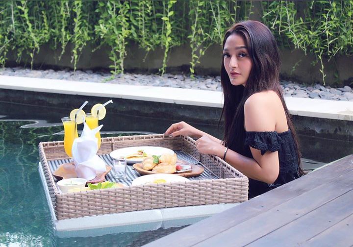 Tak ingin ketinggalan tren, Siti tampak sudah merasakan bagaimana menikmati floating breakfast. Menyenangkan sekali ya sepertinya bisa menikmati makanan sambil berendam?