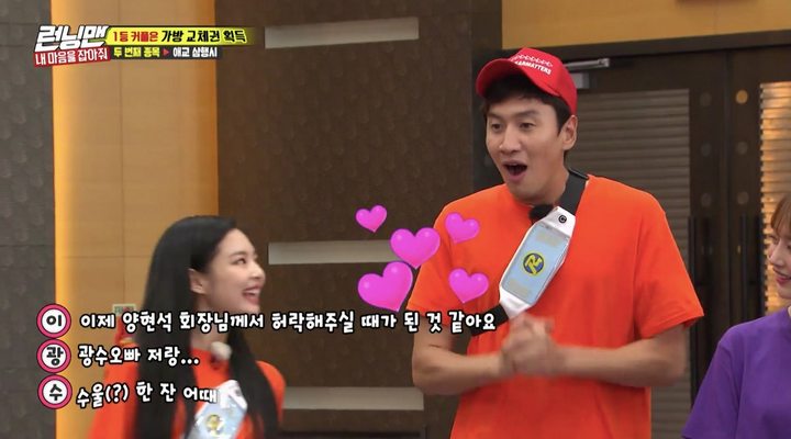 Pada episode tersebut, "Running Man" mengadakan "couple race" di mana para member acara dan bintang tamu berpasang-pasangan untuk menang. Dalam kesempatan itu, salah satu misi yang harus mereka lakukan adalah pertarungan puisi akrostik yang penuh aegyo. Pada misi tersebut, para bintang tamu harus bertarung dengan satu sama lain untuk menampilkan puisi akrostik yang paling imut.