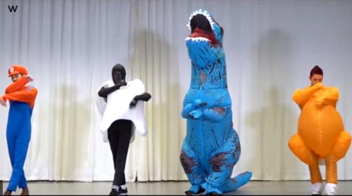 [=JR] memakai kostum dinosaurus T-Rex berwarna biru dan “mengganti nama” dengan Jjerano Saurus. Dia bahkan tidak bisa memperlihatkan wajahnya. Terakhir yaitu Baekho dengan kostum ayam potong berwarna oranye dan menamai dirinya Ho-Dadak.