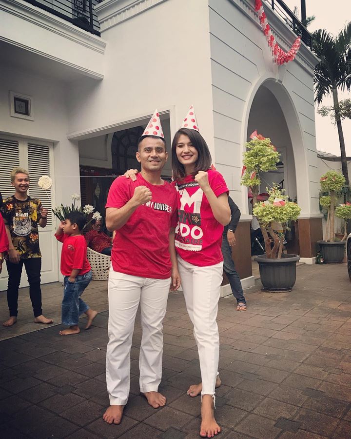 Penyanyi Judika dan sang istri, Duma Riris tak ingin ketinggalan menyambut kemeriahan HUT RI. Pasangan tersebut tampak mengikuti lomba makan kerupuk kompak dengan gaya baju kaos merah dan putihnya.