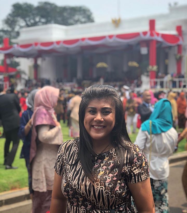 Momen upacara di Istana Negara ini menjadi harapan Ayu Dewi sejak keci. Tak melewatkan kesempatan, ibu 2 orang anak tersebut tampil mengenakan baju kurung dan beberapa aksesoris juga konder berwarna keemasan.
