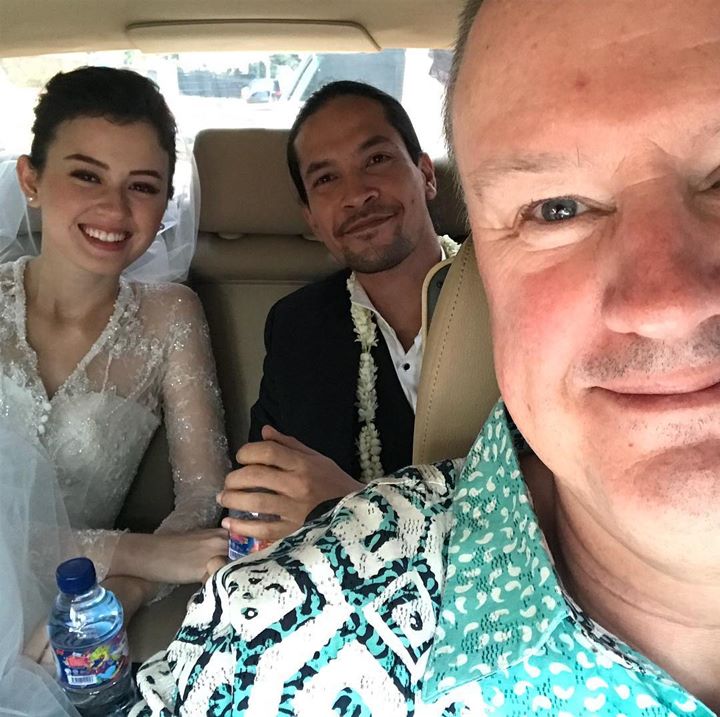 Bukannya mengunggah foto formal saat prosesi pernikahan, ayah Kim, Nigel Rydel lebih memilih memperlihatkan selfie di dalam mobil bersama kedua pengantin yang tengah berbahagia.