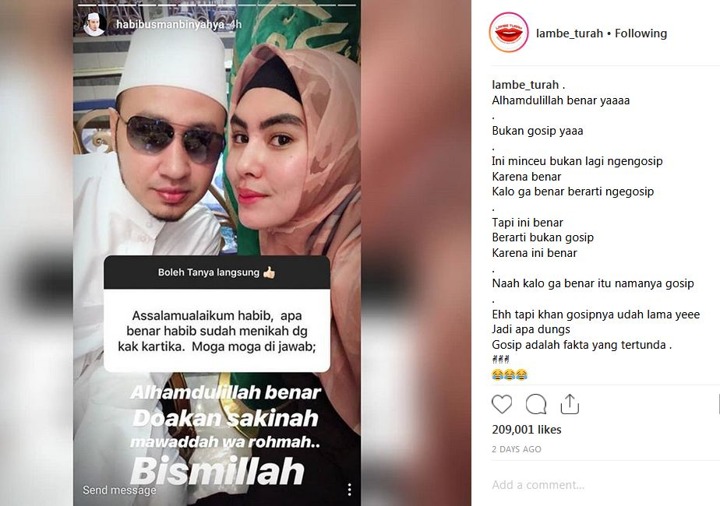 Hal itu disampaikan Habib Usman melalui fitur pertanyaan di Instagram. Memajang fotonya bersama Kartika, ia menuliskan "Alhamdulillah benar (soal menikah dengan Kartika Putri). Doakan sakinah mawaddah wa rohmah. Bismillah," tulis Habib Usman.