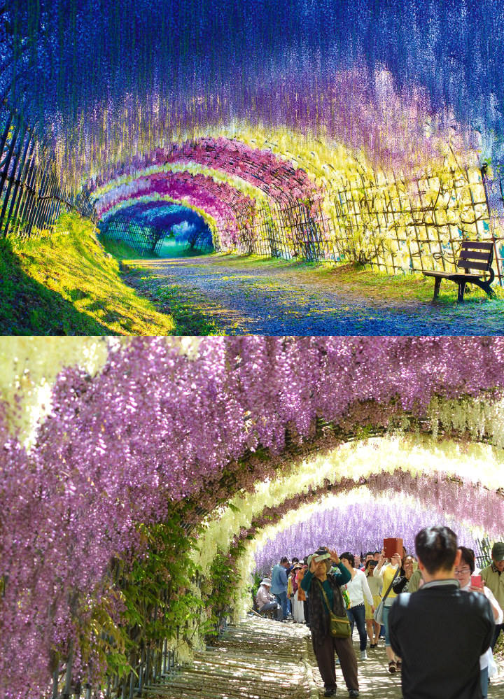 1. Terowongan Wisteria di Jepang yang Menggantung dengan Indahnya Sepanjang Jalan