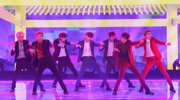 Penuh sorakan meriah, dalam ajang pencarian bakat tersebut, BTS menampilkan lagu 'IDOL'.