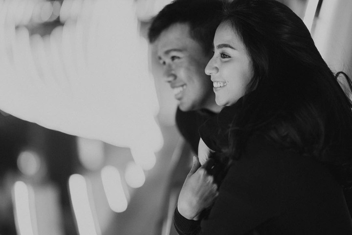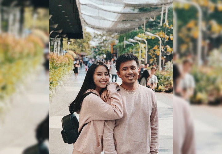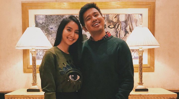 Layaknya pasangan yang sedang kasmaran, Joshua dan Clairine tampak serasi mengenakan sweater dengan warna senada.