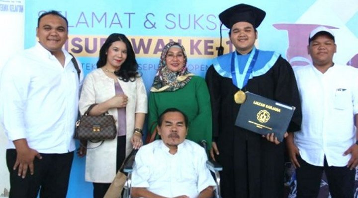 Meski harus menggunakan kursi roda, Mat Solar rupanya tidak mau absen dari acara wisuda sang anak.