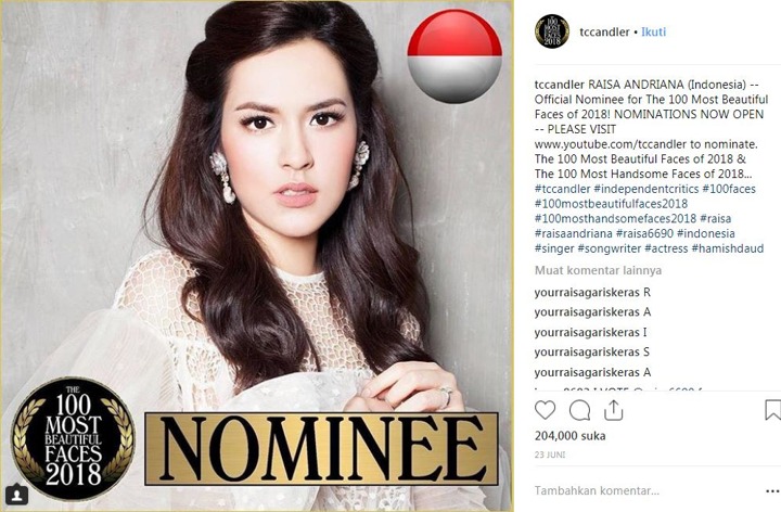 Penyanyi Raisa kembali menghiasi nominasi 100 orang tercantik di dunia versi TC Candler. Popularitas pelantun "Kali Kedua" ini memang sudah tak lagi diragukan.