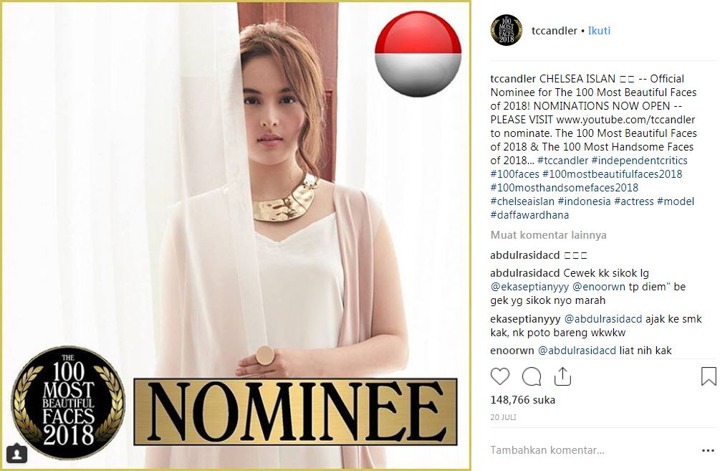 Nama Chelsea Islan juga bukan termasuk nama yang baru dalam kontes 100 wajah tercantik versi TC Candler. Tahun lalu, kekasih Daffa Wardhana ini berhasil menembus peringkat ke-93.
