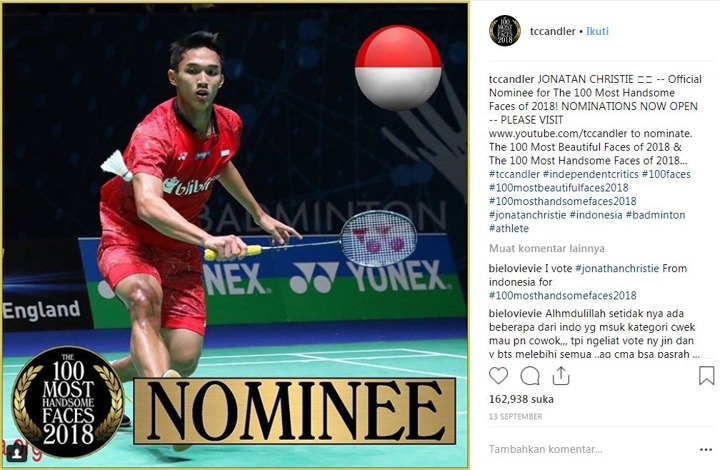 Benar saja, digandrungi banyak wanita berkat bakat olahraga dan wajah tampannya, Jonatan berhasil ikut dalam nominasi versi TC Candler. Kolom komentar foto laki-laki yang akrab disapa Jojo inipun ramai dengan rasa bangga para masyarakat Indonesia.
