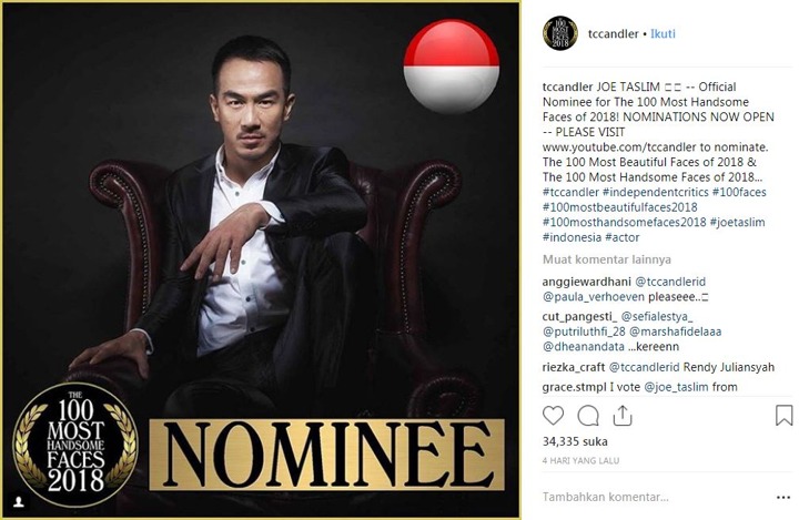 Bicara soal tampan, aktor Joe Taslim juga masuk kategorinya. Ya, ia berhasil masuk dalam urutan ke-92 dalam nominasi 100 wajah tertampan versi TC Candler tahun 2017 lalu. Kali ini, ia rupanya kembali dimasukkan nominasi.