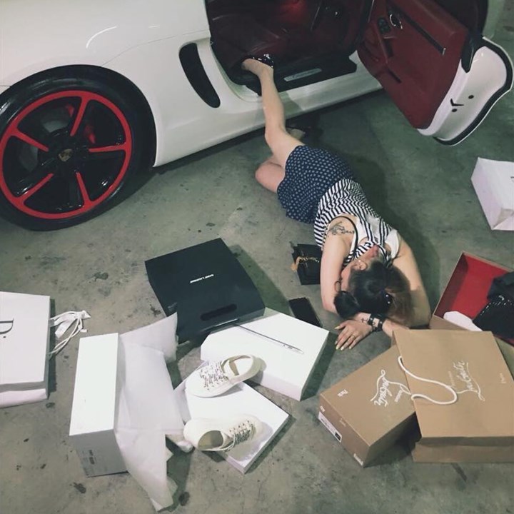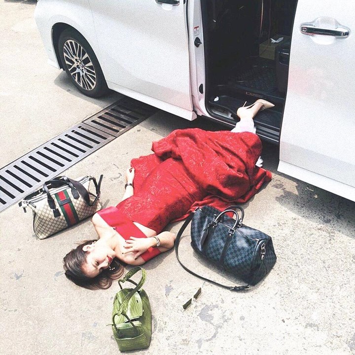 MoA Aeim terjatuh dari mobil mewah putihnya dengan membawa barang belanjaan.