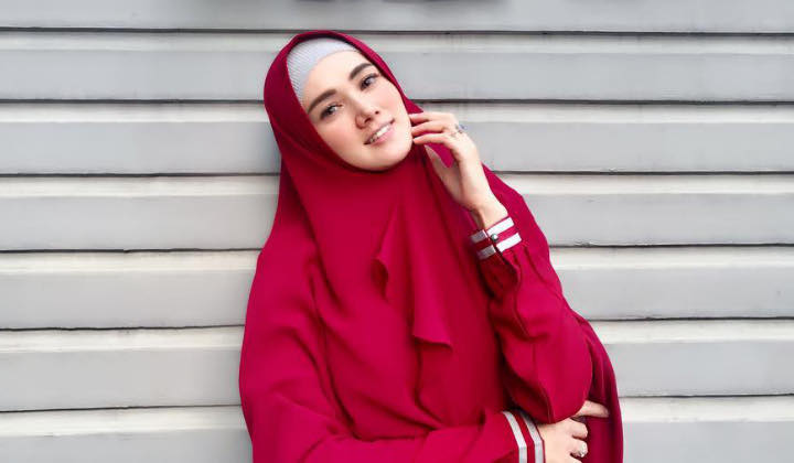 Ibu lima anak itu pun tampil cantik mengenakan busana syar'i bernuansa biru lengkap dengan hiasan di kepala. Ia melenggang sambil tersenyum ke arah penonton dan berjalan di atas catwalk.
