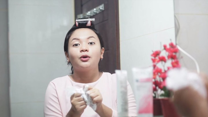 Tak langsung ke bagian inti, Prilly juga memamerkan bagaimana ia biasanya membersihkan make up di wajahnya. Ia juga enggak segan memamerkan wajahnya yang tanpa make up, lho. Setelah itu, ia mencuci wajahnya dengan sabun pembersih muka.