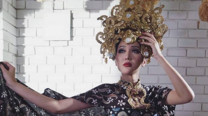 Rupanya busana cantik yang tengah Lucinta kenakan ini adalah hasil rancangan dari kain Ulos. Sementara itu, penampilan Lucinta kian menawan dengan rambut yang disanggul rapi dengan dipermanis anting berukuran cukup besar.