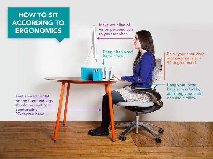 Jika kalian bekerja menghadap komputer, miringkan layarnya sedikit ke atas agar kalian terpaksa duduk tegak. Selain itu, perlu mengatur ketinggian kursi dengan menggerakkan dudukan kursi naik turun jika posisi layar komputer tidak bisa di atur.