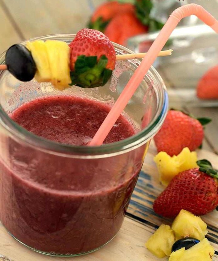 Untuk membuatnya, kalian memerlukan stoberi, anggur dan nanas masing-masing satu gelas. Masukkan ketiga buah-buahan tersebut ke dalam blender, kemudian campurkan air putih dan es batu sesuai dengan selera. Jus ini bisa kalian jadikan pilihan untuk menggantikan minuman manis yang tidak sehat.