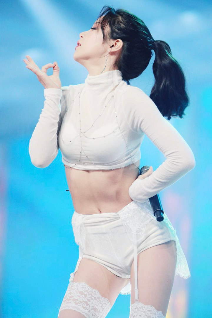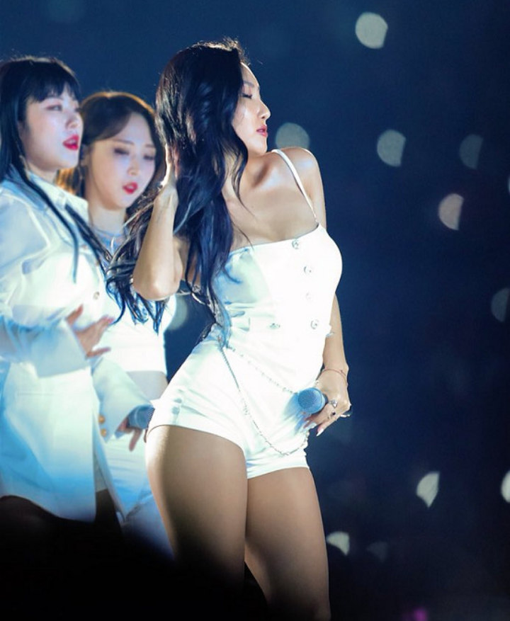 Saat comeback bersama Mamamoo, Hwasa tampil dengan celana denim pendek dan atasan berwarna krem yang ketat. Busana tersebut membuat kulit gelapnya semakin eksotik.