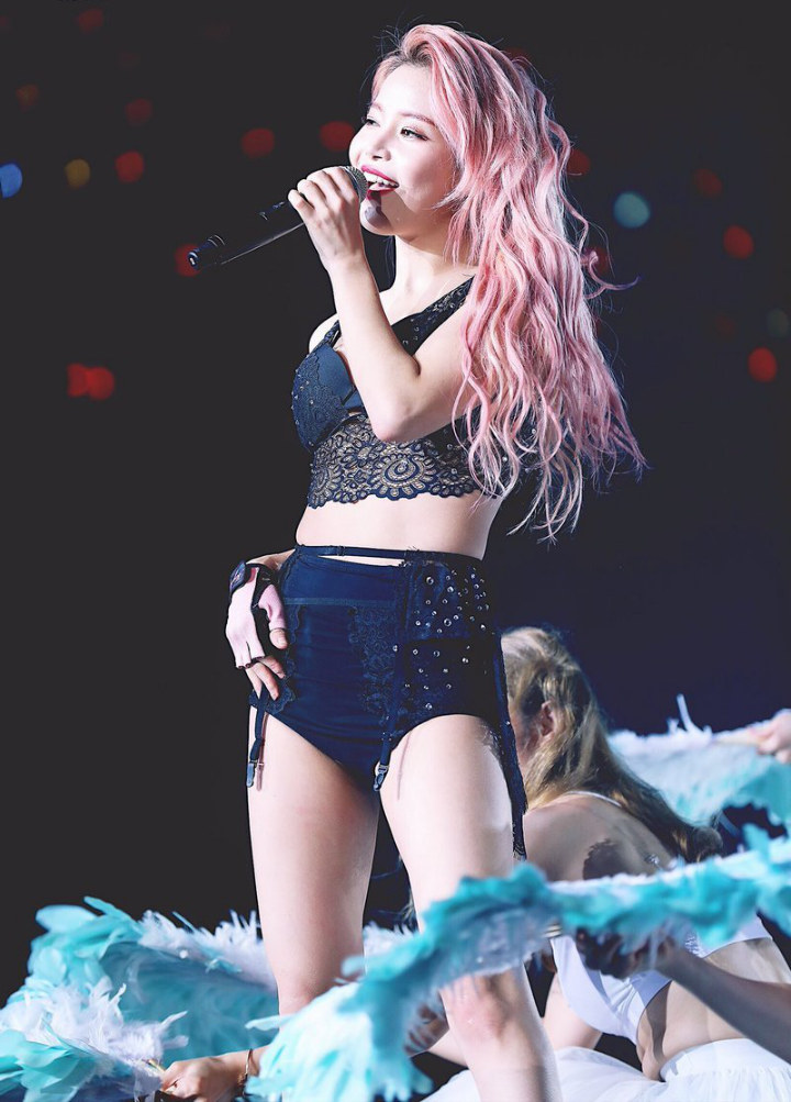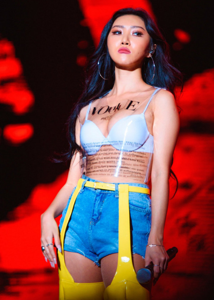Kritik terhadap dirinya ternyata tak membuat Hwasa gentar, ya. Busana yang ini seksi banget.
