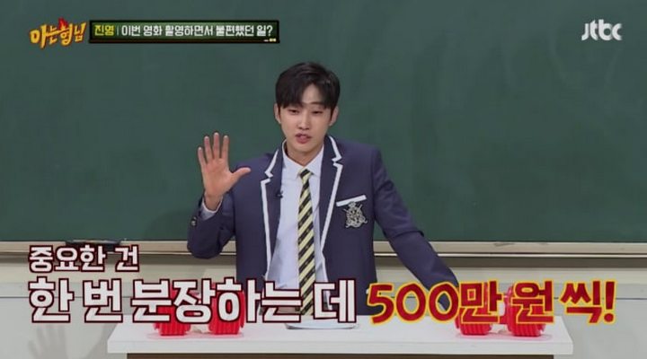 Di episode terbaru "Knowing Brothers", Jinyoung memberi tebakan pada para anggota untuk menjawab apa yang membuatnya tak nyaman selama syuting film tersebut. Jinyoung sendiri harus menggunakan makeup efek spesial selama syuting.