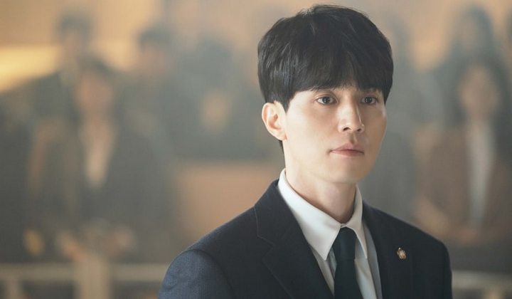Lee Dong-wook menunjukkan ekspresi serius sebagai pengacara populer yang sedang berada di ruang persidangan.