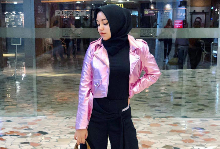 Pengen tampil stunning saat jalan-jalan? Kalian bisa mencontoh OOTD ala Salma ini. Ia mengenakan busana serba hitam kemudian jaket kulit pink mencolok.