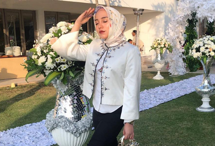 Buat yang ingin ke kondangan, kalian bisa mencoba OOTD satu ini. Padukan blazer putih dengan celana hitam dan hijab motif. Penampilan ini enggak ribet dan tetap resmi.