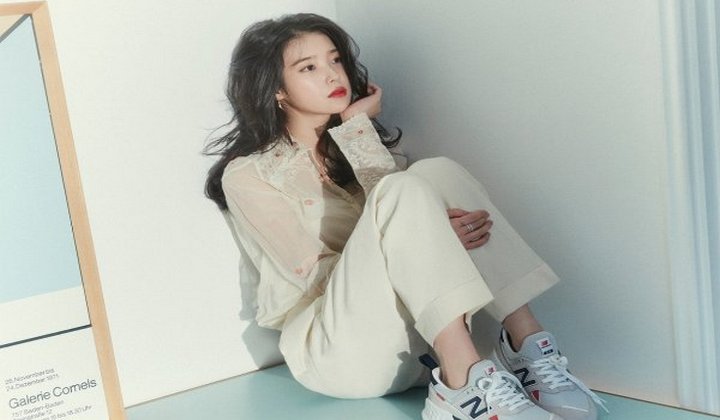 Di foto lain, IU berpose duduk di atas sebuah meja sambil memangku wajahnya seakan sedang galau. Pemotretan ini sendiri rupanya juga bagian dari iklan untuk merek sepatu sneakers yang dibintangi oleh IU.