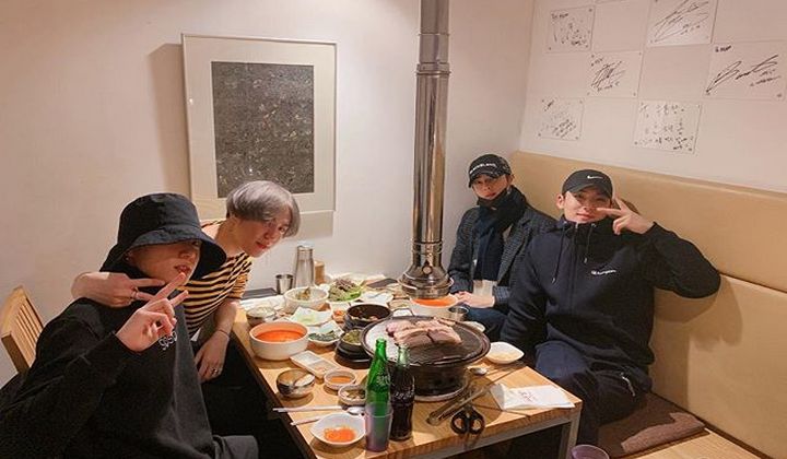 Lewat akun Instagram-nya Minggyu mengunggah foto kebersamaannya bersama Jungkook dkk. Dalam foto tersebut tampak keempatnya sedang menikmati lezatnya daging pangang serta minuman wine.