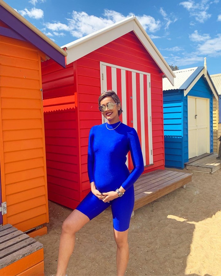 Memamerkan perut buncitnya, Kimmy tampak seksi memakai busana ketat berwarna biru neon. Ia berpose menggunakan di depan Brighton Bathing Boxes.
