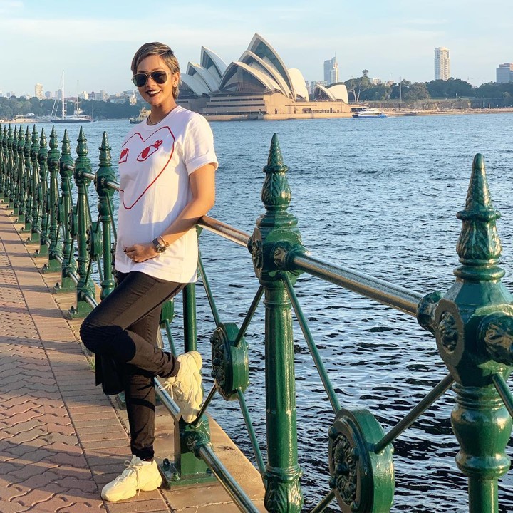 Meski hanya menggunakan kaos, Kimmy tetap mengutamakan penampilan hamilnya. Benar saja, ia terlihat menawan dengan tampilan sporty.