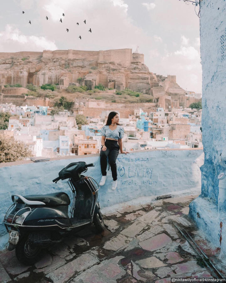 Tak melulu menggunakan rok, Nikita juga tampil nyaman mengenakan celana panjang dan sneakers. Untuk atasannya, gadis berambut panjang ini memilih crop top cantik berwarna senada dengan latar belakang pemandangan di India.