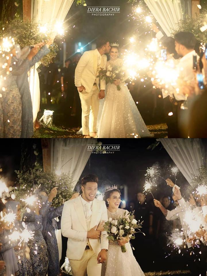 Saat memasuki tempat acara, Ammar dan Irish saling bergandengan. Keduanya disambut tamu yang menyalakan kembang api. Meriah banget, ya.