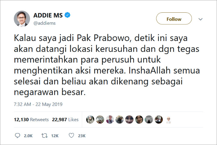 Addie MS berharap bisa menjadi Prabowo Subianto nih agar dikenang jadi negarawan besar. Ada yang sependapat?