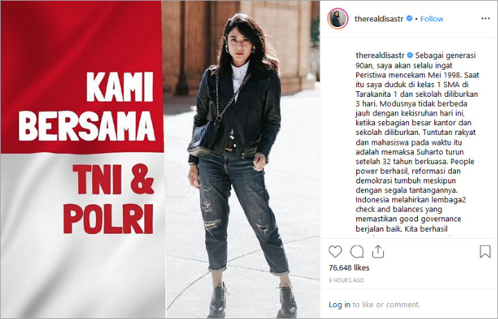 Bak terjebak nostalgia, Dian Sastro mengajak untuk mengingat kejadian mencekam di Indonesia pada tahun 1998 ketika melihat Aksi 22 Mei.
