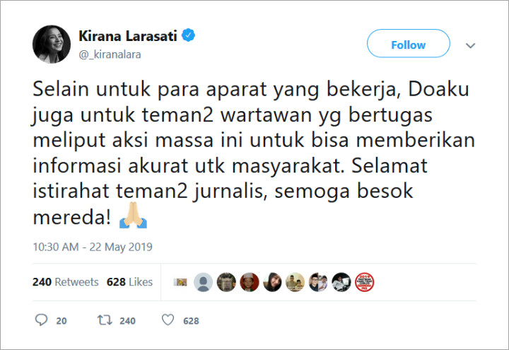 Bangga dengan pekerjaan saudara sebangsa, Citra Kirana panjatkan doa untuk aparat keaman yang bertugas dan wartawan di lokasi Aksi 22 Mei lho.