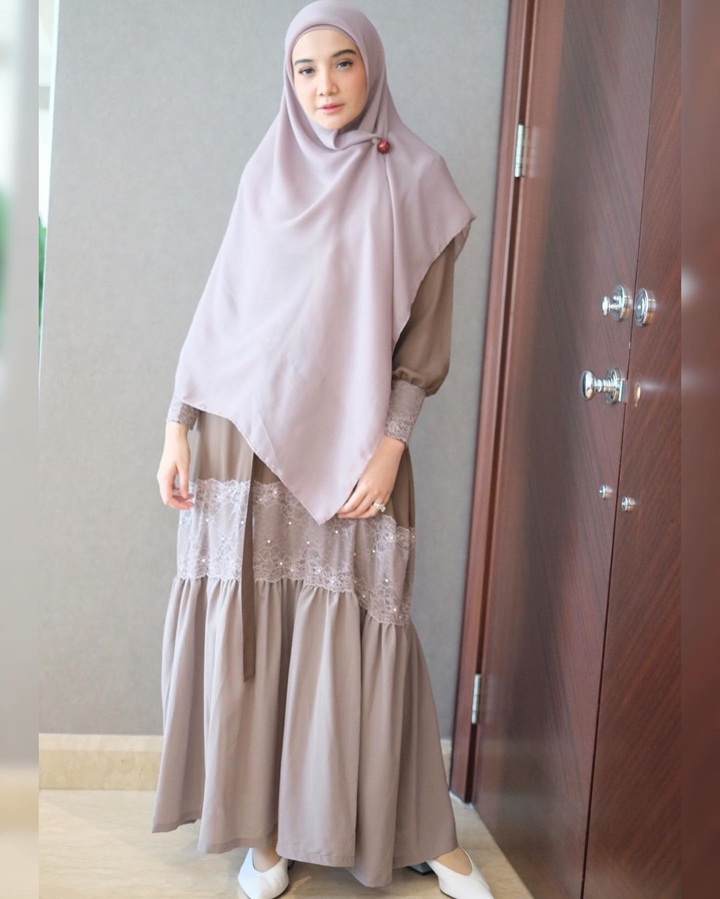 Kamu ingin tampil kalem pas Lebaran? Gamis cantik warna mocca yang dipadukan dengan hijab warna senada ala Zaskia Sungkar ini bisa banget jadi inspirasi.