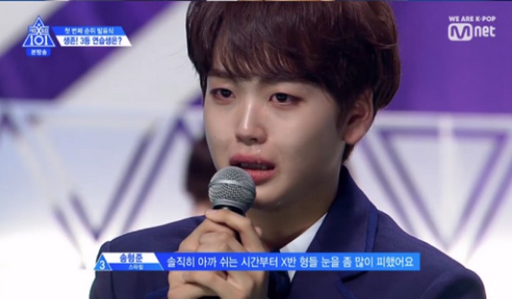 Salah satu kontestan acara 'Produce X 101' yakni Song Hyeongjun menangis ketika namanya diumumkan berada di peringkat tiga besar oleh MC Lee Dong Wook di episode terbaru.