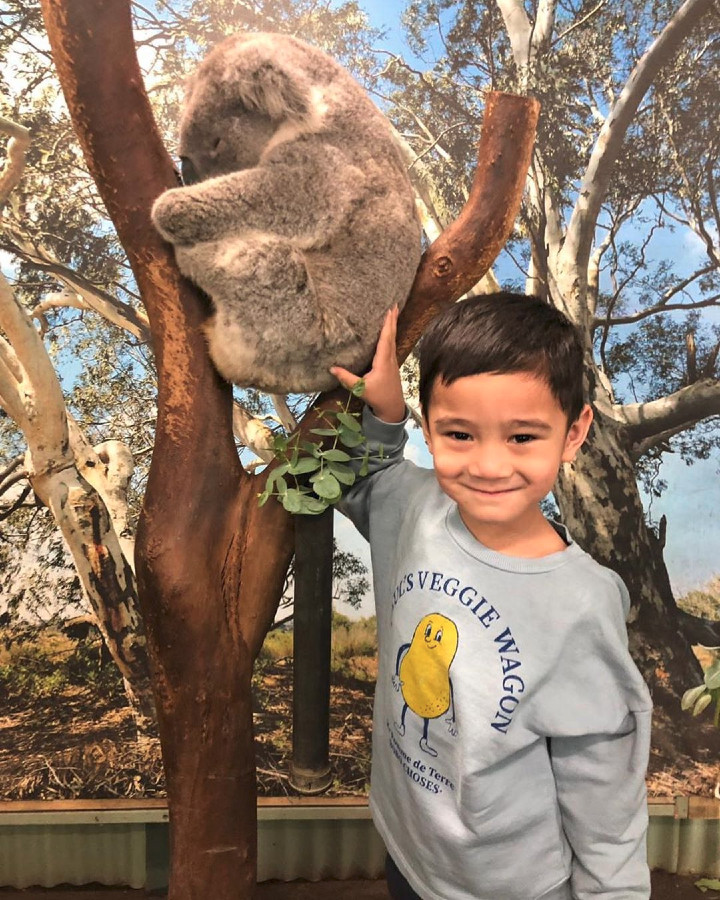 Rafathar yang baru berusia 4 tahun berani lho menyentuh koala. Potretnya lucu banget lagi, memamerkan senyum manis. Mirip Raffi atau Nagita, nih?