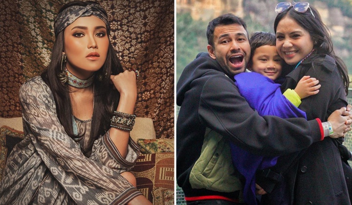 Raffi tampak menggendong Rafathar di atas pundaknya seraya menarik kedua tangan putranya. Sedang Gigi berada di depan mereka berdua sambil lemparkan senyuman tipis di hadapan kamera.