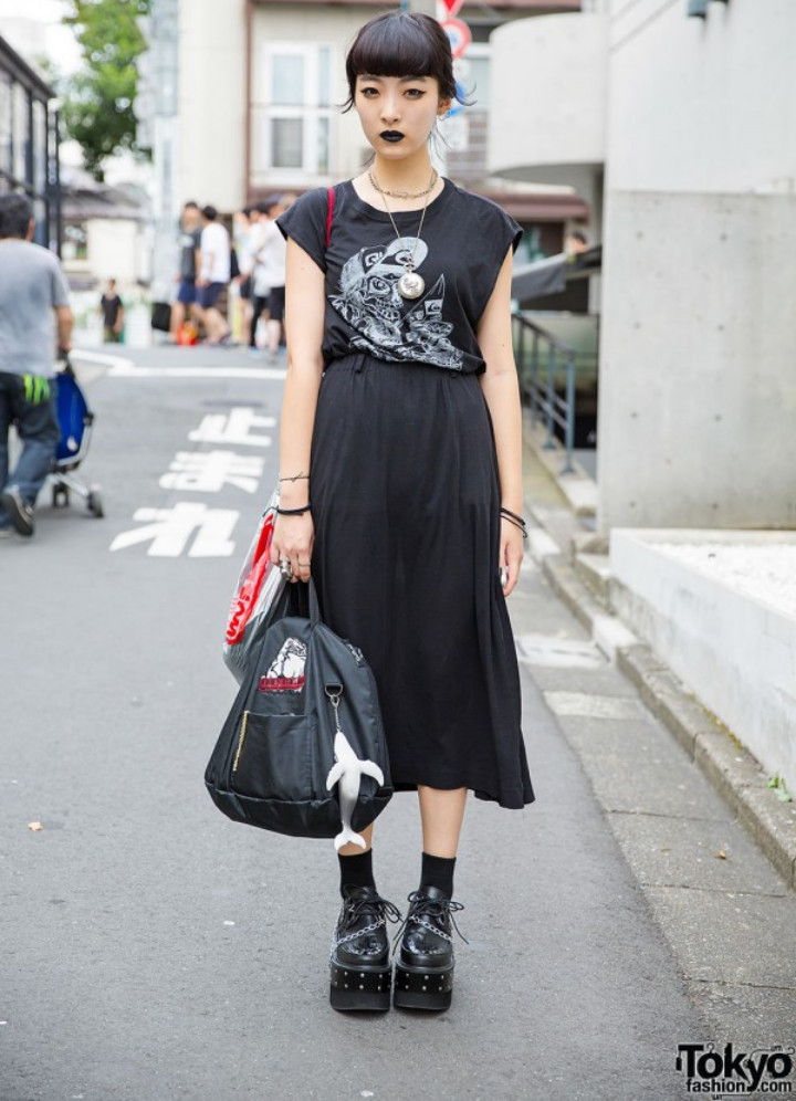 Suka memakai pakaian berwarna hijam? Tenang, Harajuku style tetap bisa digunakan panutan. Siapkan kaos favoritmu, rok di bawah lutut, tas tangan, dan sepatu. Ingat semuanya harus berwarna hitam.