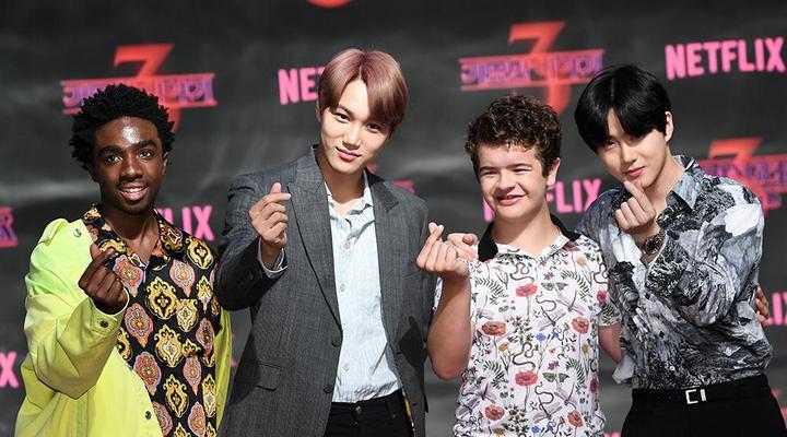 Tampak seperti kawan lama, keempatnya sangat tidak canggung saat bertemu dan berpose bersama di depan kamera. Tampak Caleb dan Gaten memberikan pose finger heart yang sering diperlihatkan selebriti Korea Selatan.