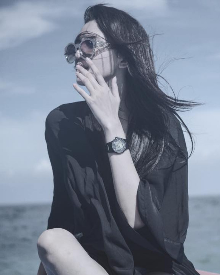 Alexa dengan rambut hitam berkibar tampak sangat menyatu dengan latar langit dan laut di belakangnya. Pose memegang kaca mata hitam pun tampaknya membuat cantik foto itu. Tone gelap yang dipakai dalam foto itu juga memberikan kesan elegan.