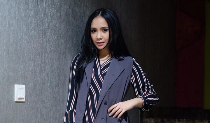 "#NagitaSlavina wearing #Burberry 'Cut-out Detail Icon Stripe Silk Oversized Shirt' from burberry.com $1,750 / 24.400.000 IDR," tulis admin dari akun tersebut.