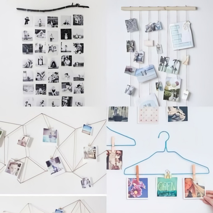 Cukup tempelkan foto-fotomu di tali dengan menggunakan selotip, kamu juga bisa memakai penjepit kertas. Susun sesuai dengan seleramu, lalu ikat tali yang telah berisi foto di paku. Kamu bahkan bisa memakai gantungan baju, lho agar semakin menarik. Sederhana, bukan?