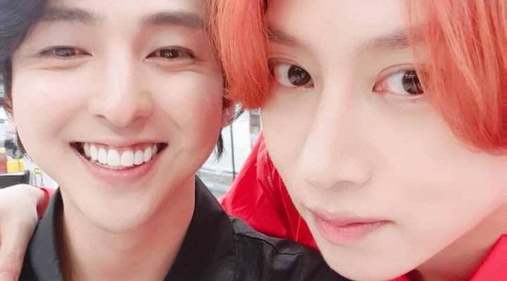 Tampak keduanya dengan akrab selfie. Heechul mengenakan kemeja berwarna merah yang senada dengan warna rambutnya, sementara Ki Bum mengenakan busana berwarna hitam. Keduanya juga sempat merekam video lucu.