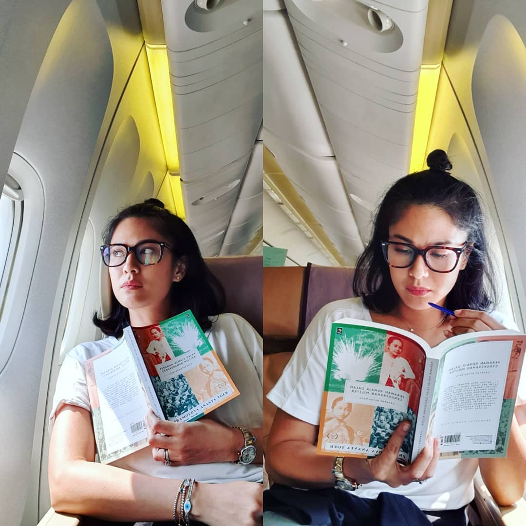 Aktris cantik Dian Sastro selalu mengusahakan membawa buku kemana pun ia pergi, lho. Khususnya ketika melakukan perjalanan jauh, bagi Dian membawa buku di pesawat itu wajib!