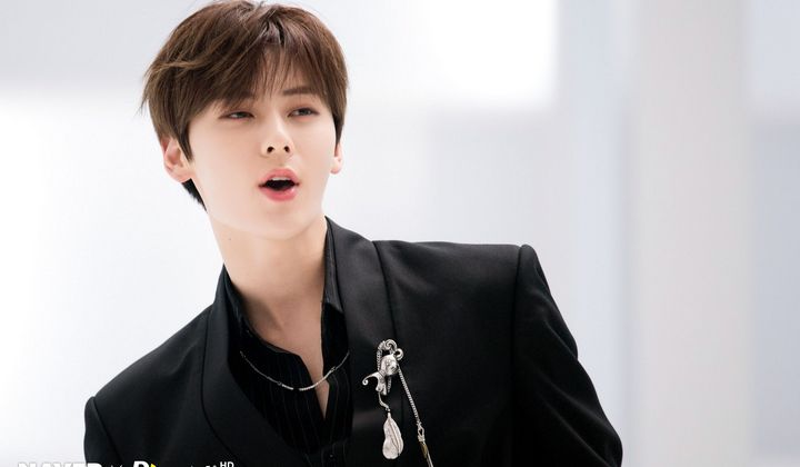 Mantan member Wanna One, Hwang Minhyun tampil percaya diri dengan polesan lipstik saat didapuk menjadi model untuk majalah Cosmopolitan yang berkerja sama dengan merek kosmetik MAC.