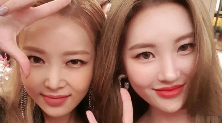 Tak mau melewatkan kesempatan, Sunmi dan Yubin pun selfie bersama. Tampak keduanya memiliki warna rambut yang hampir serupa. Sunmi sendiri mengenakan balutan dress berwarna hitam putih sementara Yubin lebih maskulin dengan blazer oversized.