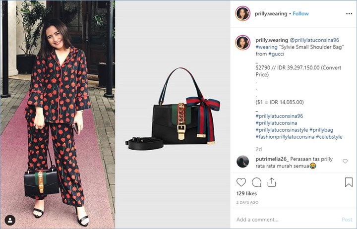 “ @prillylatuconsina96 #wearing "Sylvie Small Shoulder Bag" from #gucci _ $2790 // IDR 39,297,150.00 (Convert Price) . . . ($1 = IDR 14,085.00),” bunyi caption akun itu di unggahan lainnya di hari yang sama.
